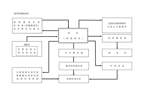 第5条 天気予報に注意し、異常出水が確認された時には、色麻町地域防災計画に基づき体制を整えるものとする。