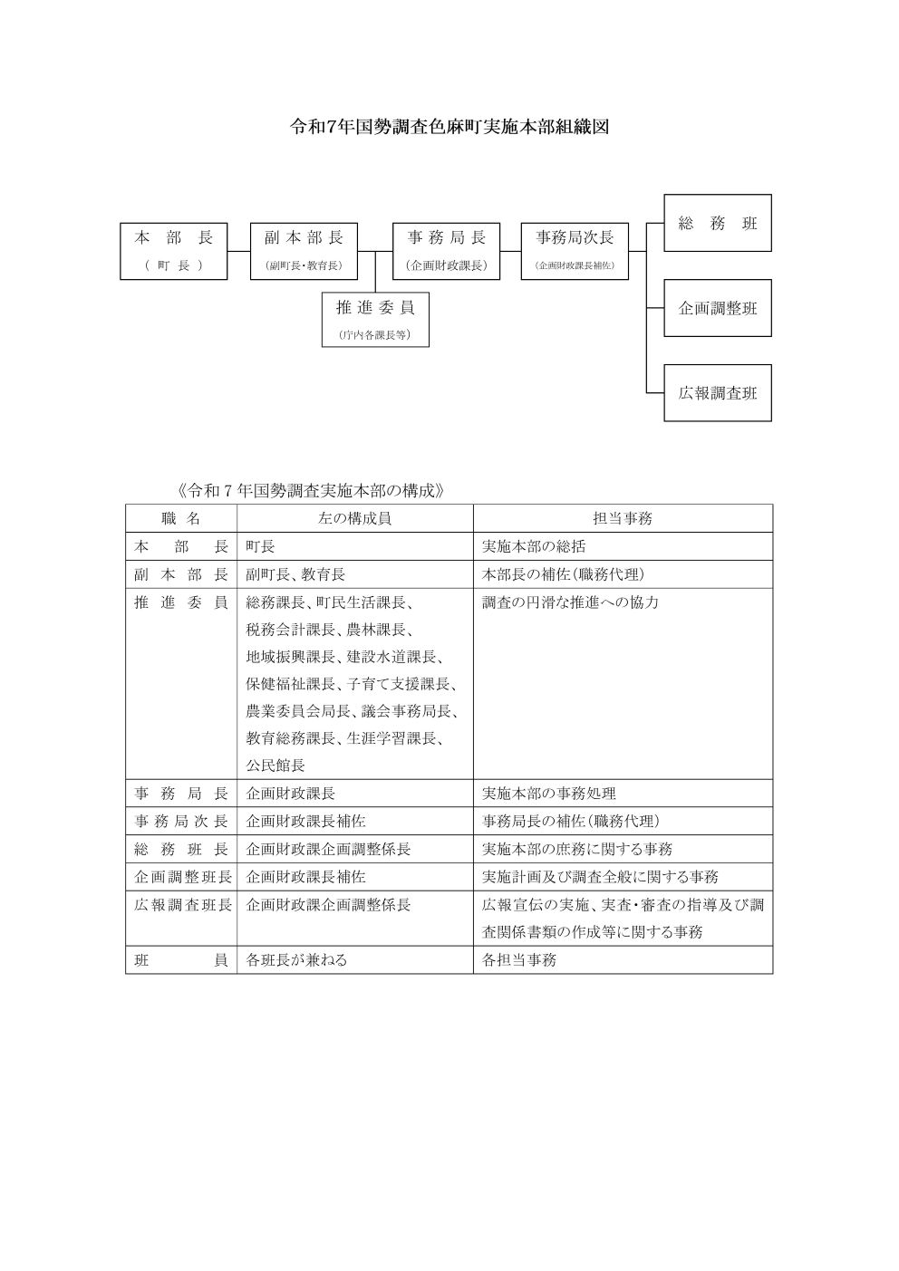 第1条 令和7年国勢調査(以下「国勢調査」という。)の実施に際し、これを正確かつ円滑に進めるため、令和7年国勢調査色麻町実施本部(以下「実施本部」という。)を設置する。
