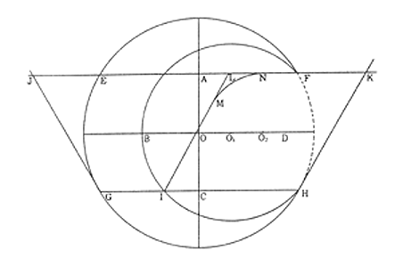 Iを通つてHKの平行線を引き、EFとの交点をLとしLILFの二等分線とx軸との交点O2を求め、O2を中心にIL、LFに接する円弧を描き、その交点をそれぞれM、Nとする。 |
