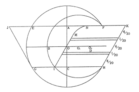 求める図形はJG、弧GH、HK、KF、弧FE、EJと弧FBIH、HI、IM、弧MN、NFに囲まれ、上述の1/20間隔を除く部分である。 |
