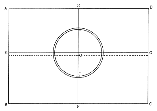 ※黄金分割の原理に基づいた近似値とする。 2)HO:OF=15:17 ※中心点Oは上部へ1/32移動した点とする。 3)EO:OG=1:1 ※中心点OはEGの中点とする。 4)HI:IO=7:8 5)OJ:JF=8:9 ※Oを中心とする円の直径はHFの1/2とする。 6)町旗の地色は純色緑、マークは純色赤、セパレーシヨンは純白とする。 7)旗竿風上は左側とする。 図案製作者 滋賀県愛知郡愛東町妹 奥村よねぞう氏 図案図法者 宇美中学校教諭 池田正臣氏 |