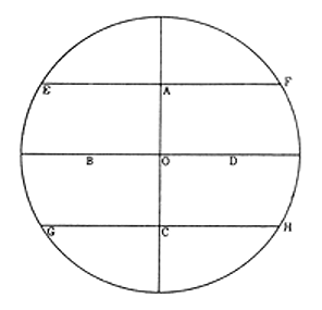 x軸、y軸上の半径の中点を、それぞれA、B、C、DとしA、Cを通るx軸との平行線と円周との交点をE、F、G、Hとする。 |