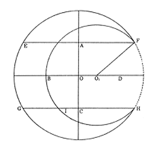 B、Fから等距離にある点O1をx軸上に求め、O1を中心としてB、Fを通る円を描き、GHとの交点をIとする。 |