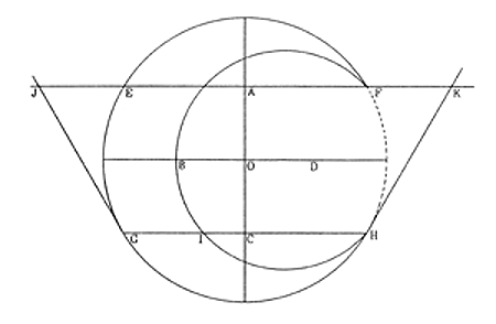 G、Hを通つて大円の接線を引き、EFの延長上との交点をそれぞれJ、Kとする。 |